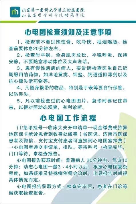 门/急诊挂号→临床大夫开申请单→现金缴费或持异地医保卡就诊患者到收费处缴费(省医保、济南市医保患者及微信、支付宝支付患者可直接到心电图室扣费)→心电图室递交申请单,排队,等待叫号→检查完毕,门口等待,拿检查报告。