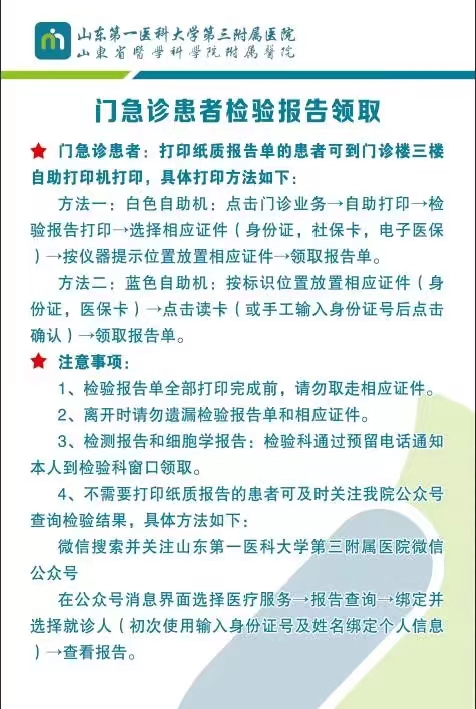 门急诊患者:打印纸质报告单的患者可到门诊楼三楼自助打印机打印,具体打印方法如下:
