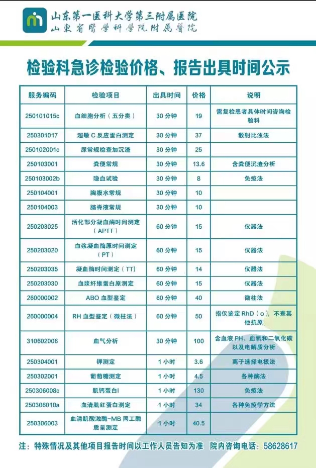 检验科急诊检验价格、报告出具时间公示