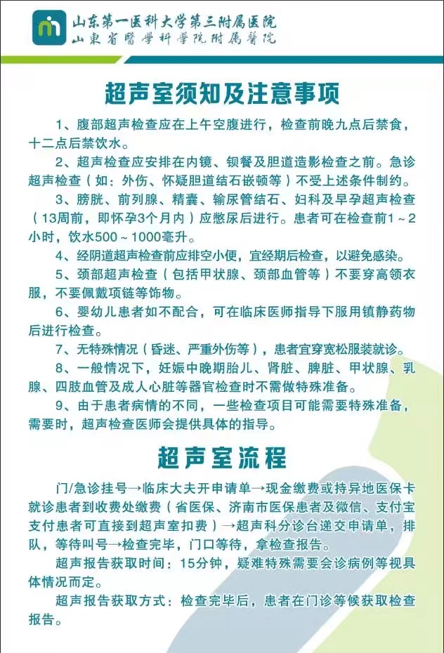 门/急诊挂号→临床大夫开申请单→现金缴费或持异地医保卡就诊患者到收费处缴费(省医保、济南市医保患者及微信、支付宝支付患者可直接到超声室扣费)→超声科分诊台递交申请单,排队,等待叫号→检查完毕,门口等待,拿检查报告。