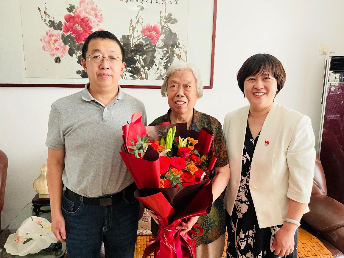 在离休干部金仪、王春荣家中,院领导为老同志送上鲜花、慰问品和杂志书刊,关切地询问老人的生活和身体情况,认真听取他们对医院工作的意见与建议,感谢他们为医院事业发展作出的贡献。