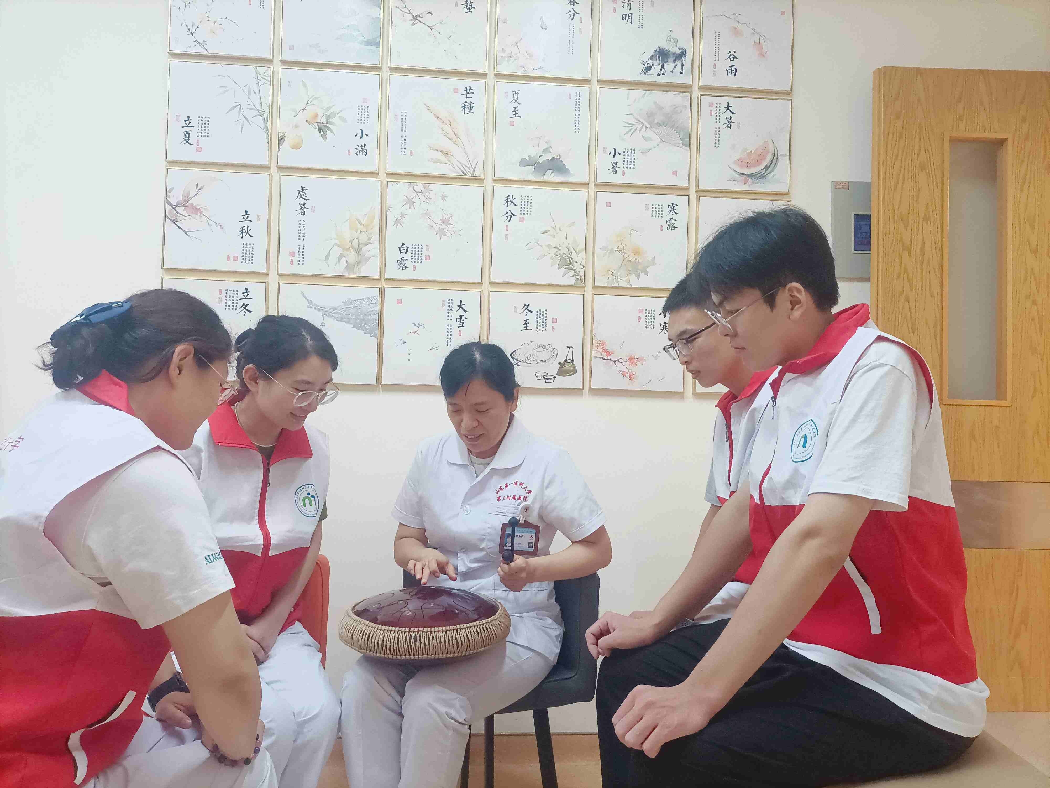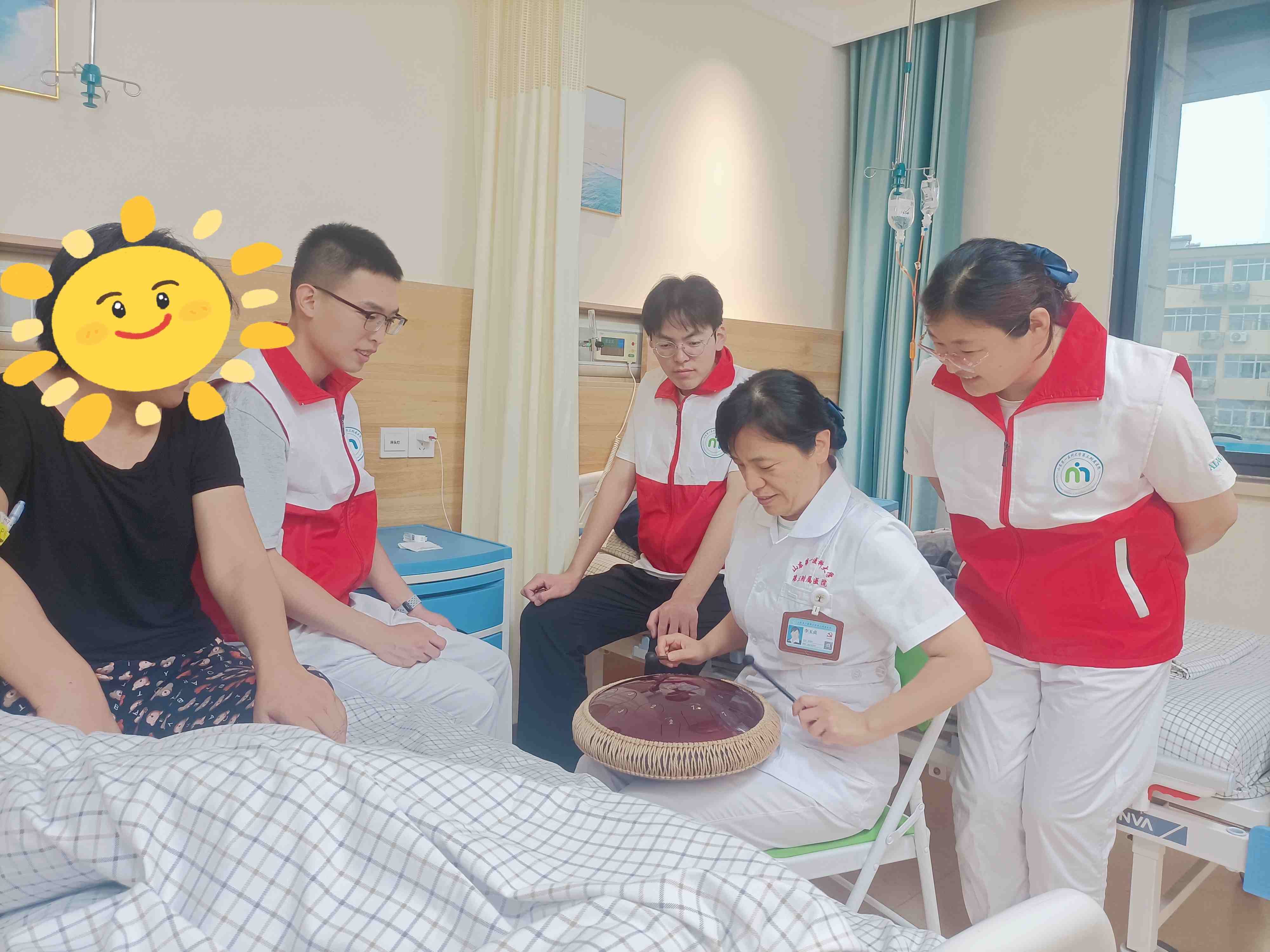 在山东第一医科大学第三附属医院安宁疗护中心,一场以空灵鼓为媒介的音乐疗愈活动正在如火如荼的进行中。疗愈师的双手在鼓面轻盈跃动,清脆的音符交织成网,旋律包裹着整个病房。那些被病痛缠身的患者,仿佛被施了魔法:有人闭目凝神,沉浸在纯粹的乐声里;有人随节奏轻轻颔首,眉宇间的焦虑与痛苦渐渐被柔和取代。一位患者动情地说:“这鼓声一响,心就静了,连身上的疼都轻了许多。”