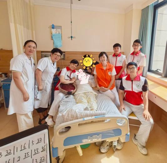 活动现场,空灵鼓的悠远音色与熟悉旋律交织。医护人员与志愿者、家属围站病床旁轻声合唱,当“朋友一生一起走”的旋律响起,赵老师眼中泛起泪光,分明是被懂得、被珍视的热流,那一刻,病房里的暖意超越了治疗本身。护士长李玉贞轻抚赵老师的手说:“今天我们都来做您的‘朋友’。”是承诺,更是最质朴的共情。