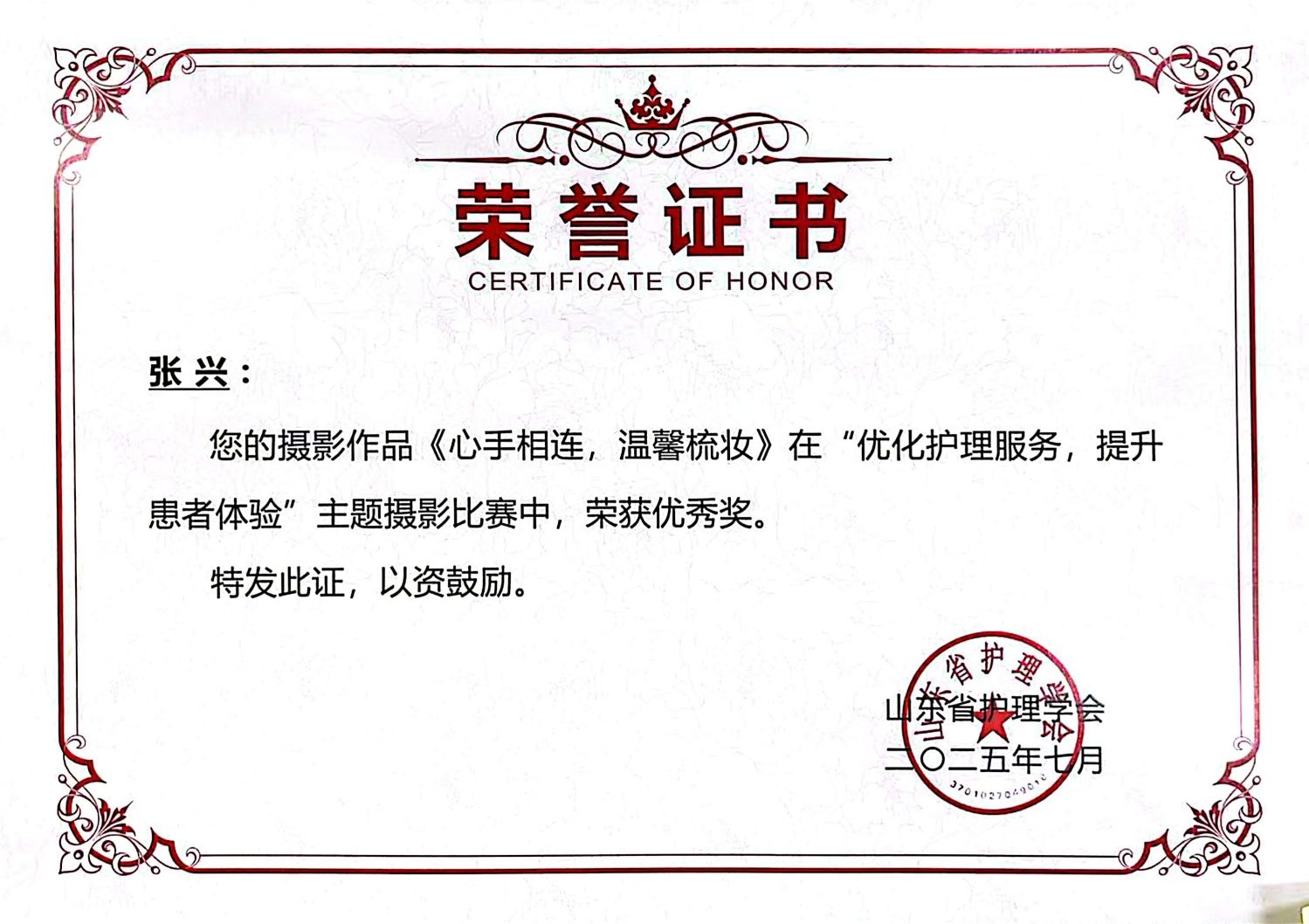 山东第一医科大学第三附属医院高度重视人文医院建设,积极组织参加山东省护理学会主办的“优化护理服务,提升患者体验”主题摄影比赛活动,医院头颈乳腺及血管外科张兴护士作品《心手相连 温馨梳妆》荣获大赛优秀奖。